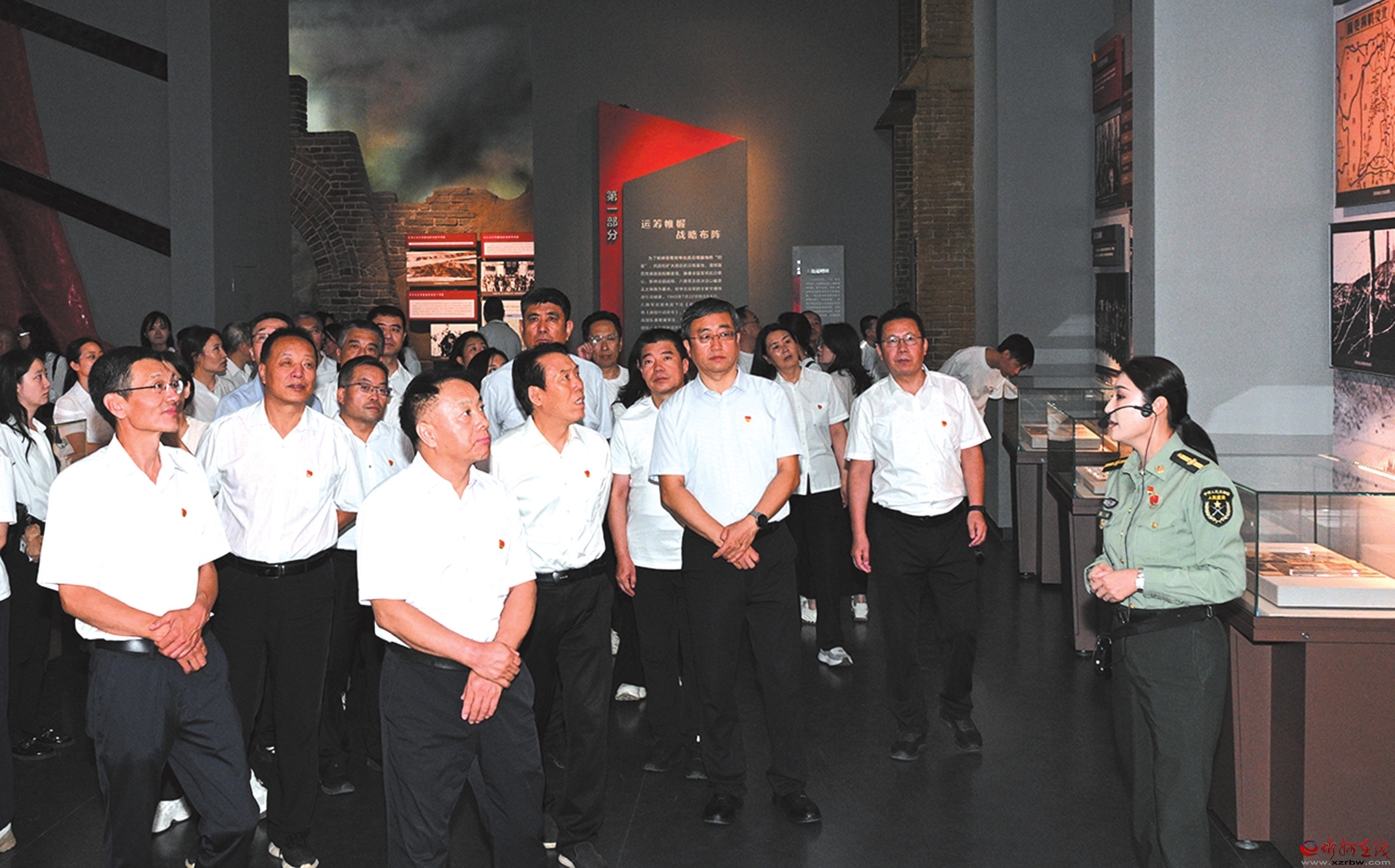 在中國人民抗日戰(zhàn)爭勝利80周年來臨之際,人行忻州市分行組織50余名優(yōu)秀黨員和黨務(wù)工作者來到陽泉市,參觀百團大戰(zhàn)紀(jì)念館,緬懷抗戰(zhàn)英烈,重溫中國共產(chǎn)黨領(lǐng)導(dǎo)抗日軍民同仇敵愾、勇御外侮的光輝歷史。圖為參觀百團大戰(zhàn)紀(jì)念館。(蔣鵬程攝)