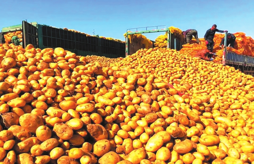 大田作物中,玉米貢獻(xiàn)了秋收“主色調(diào)”:玉米田穗大粒滿,金黃果穗綴滿秸稈,機(jī)械化收割設(shè)備穿梭田間。高粱與谷子在丘陵山區(qū)長勢喜人,紅透的高粱穗與沉甸甸的谷穗隨風(fēng)搖曳。土豆則以“地下黃金”之姿獲得豐產(chǎn),圓整塊莖從土壤中翻出,分揀后裝車外運。
