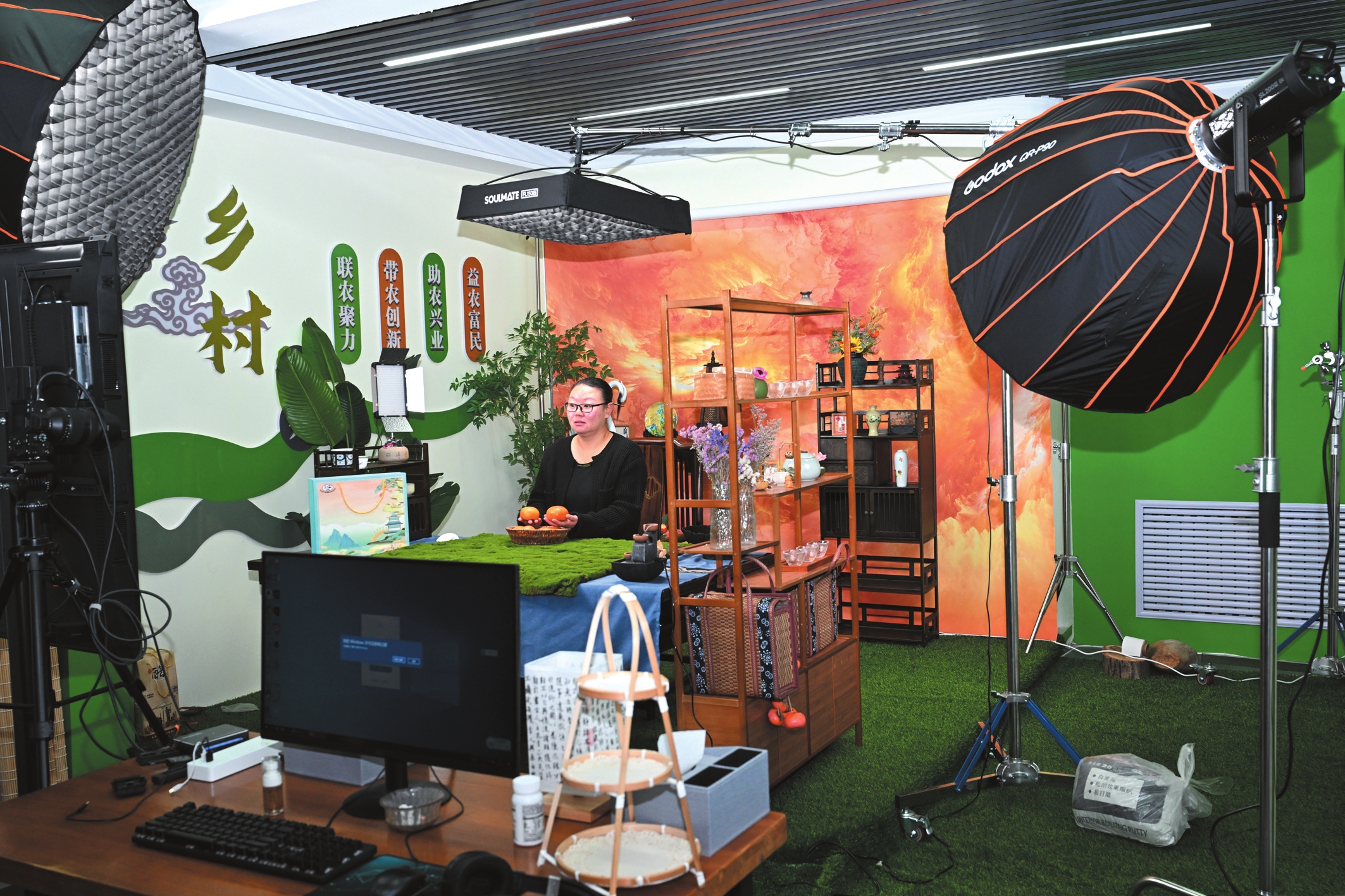 五臺(tái)縣臺(tái)城鎮(zhèn)充分發(fā)揮到村工作大學(xué)生的知識(shí)優(yōu)勢(shì),積極建起電商中心,已重點(diǎn)推出陽(yáng)白鄉(xiāng)蜂蜜、陳家莊花椒、臺(tái)城鎮(zhèn)六道木文創(chuàng)手串三類12種產(chǎn)品,日均銷售6000元,單日成交額最高達(dá)3萬(wàn)元。圖為主播直播帶貨賣(mài)柿子。(金俊賢攝)