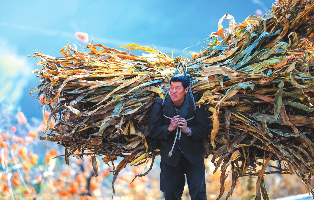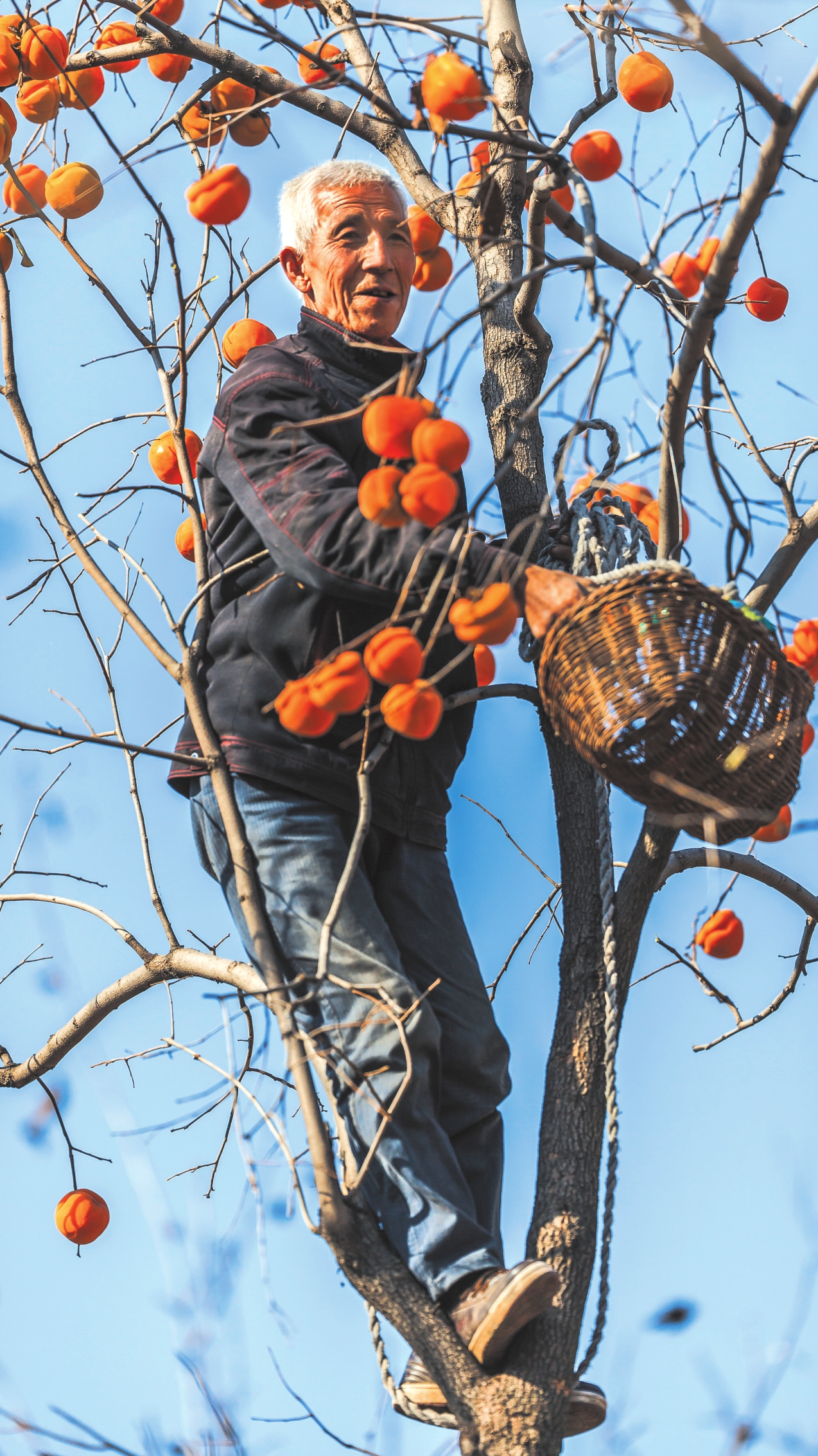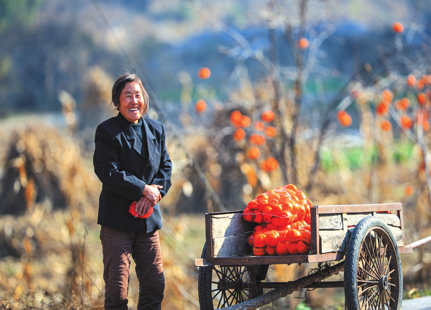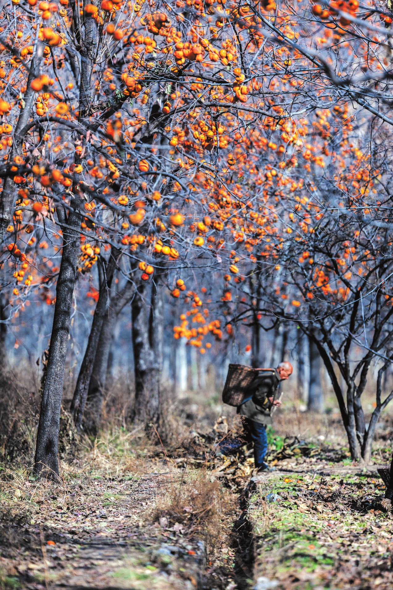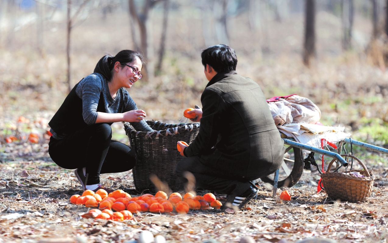 地頭那畔,景象便不同了。一對(duì)年輕的夫婦,正手腳利落地采摘、分揀柿子。竹籃里,橙紅的果實(shí)漸漸堆成小山。他們時(shí)而低語(yǔ),聲音輕得像風(fēng)拂過枝梢,說的或許是今年柿子的成色,盤算著能賣個(gè)好價(jià)錢;或許是在憧憬,等這筆錢到手,該給娃添置些什么。他們額上有細(xì)密的汗珠,眉宇間有勞作后的倦色,但那份倦色底下,卻藏不住一股子蓬勃向上的勁兒,一種屬于明天的、清亮亮的盼頭。