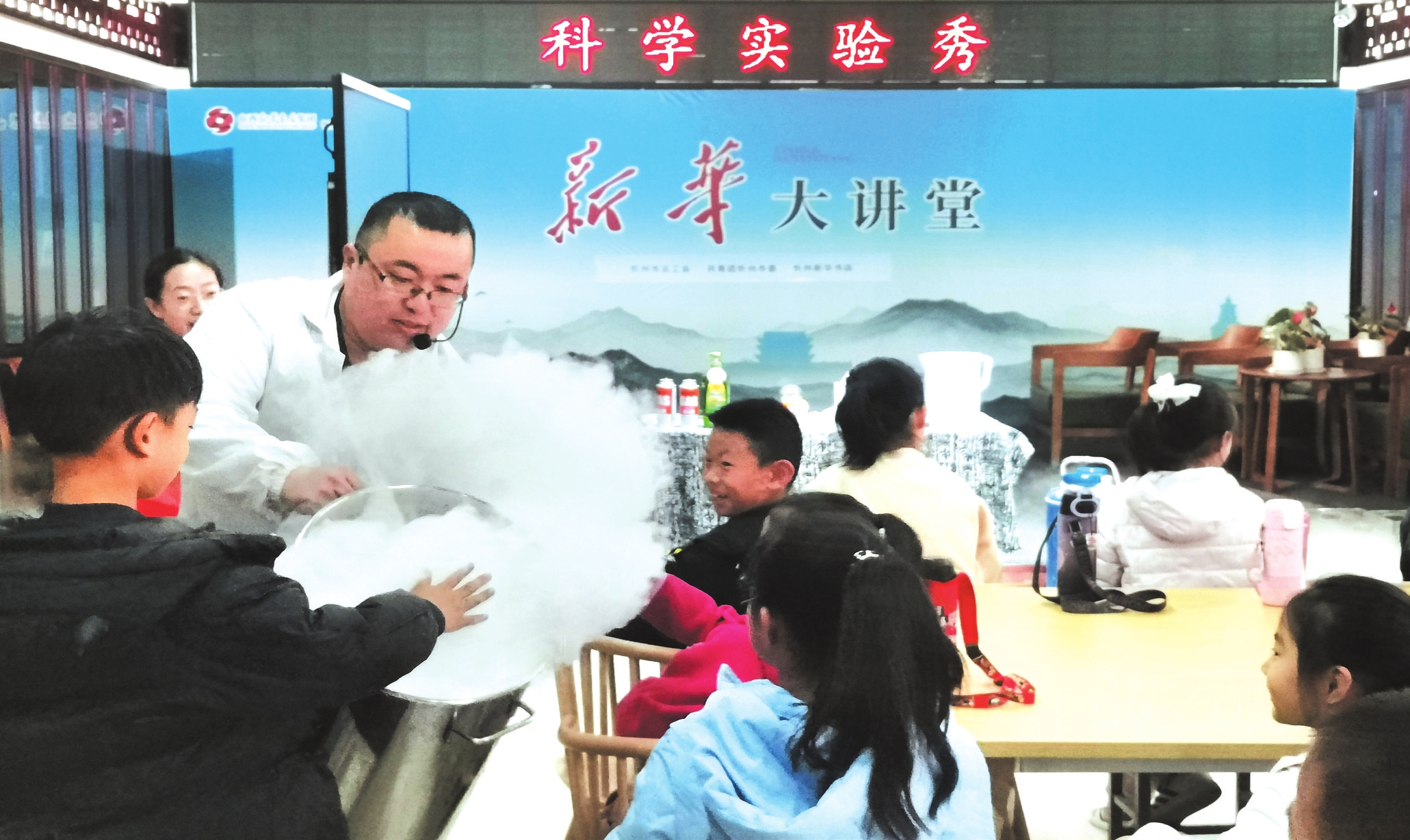近日,在市圖書(shū)大廈“騰云駕霧”科學(xué)實(shí)驗(yàn)秀上,小朋友興奮地觸摸了“白云”。由市總工會(huì)、共青團(tuán)忻州市委主辦,忻州新華書(shū)店協(xié)辦,每周一次的“新華大講堂”深受小朋友歡迎。(本報(bào)記者宮清華攝)