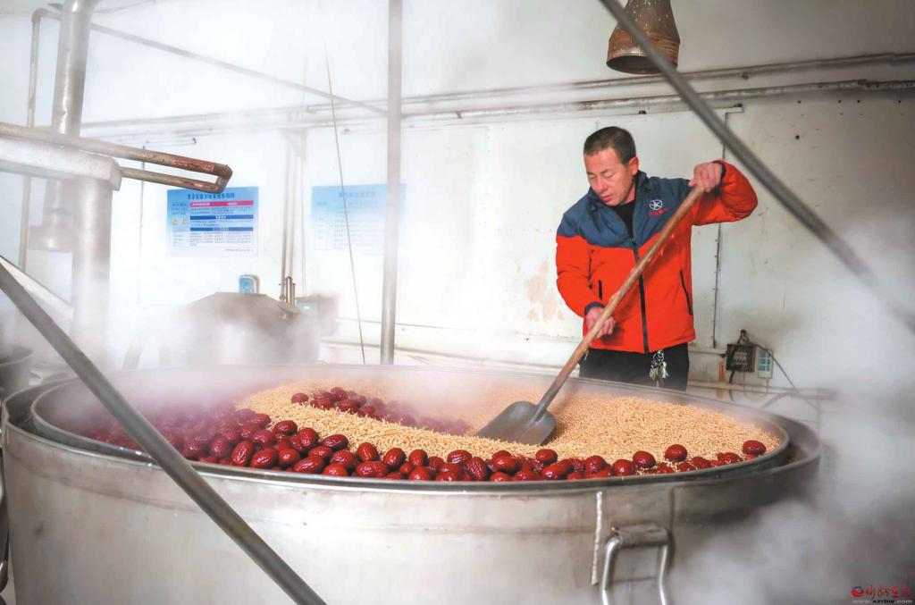 近年來,保德縣貢棗酒開發(fā)基地以“保德油棗”與枸杞入酒,不僅更好地保留了果實(shí)的溫補(bǔ)特性,也釀出了獨(dú)特的地方風(fēng)味。該基地不僅是當(dāng)?shù)赝苿?dòng)紅棗產(chǎn)業(yè)深加工、提升附加值的關(guān)鍵項(xiàng)目,也是將地理標(biāo)志農(nóng)產(chǎn)品轉(zhuǎn)化為特色商品、助力鄉(xiāng)村振興的生動(dòng)實(shí)踐。圖為保德縣貢棗酒基地,工人在蒸餾車間翻動(dòng)攪拌麥殼與紅棗等原料,車間內(nèi)蒸汽彌漫。(記者 范琛攝) (責(zé)任編輯:盧相汀) |