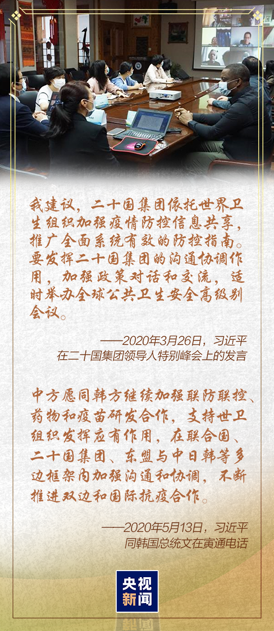G20特別峰會(huì)上的發(fā)言《攜手抗疫 共克時(shí)艱》,第73屆世界衛(wèi)生大會(huì)視頻會(huì)議開幕式上的致辭《團(tuán)結(jié)合作戰(zhàn)勝疫情共同構(gòu)建人類衛(wèi)生健康共同體》,中非團(tuán)結(jié)抗疫特別峰會(huì)上的主旨講話《團(tuán)結(jié)抗疫共克時(shí)艱》,縱觀習(xí)近平主席三次國(guó)際會(huì)議的講話,團(tuán)結(jié)攜手之意貫穿始終。