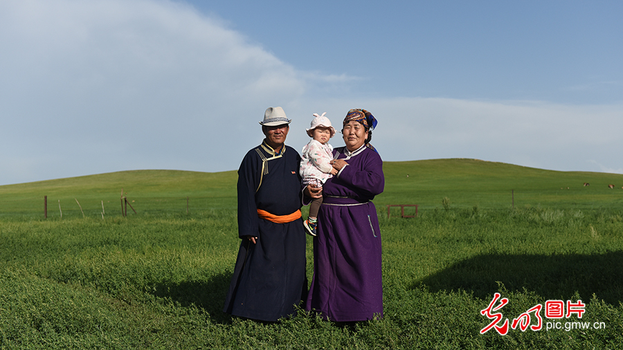 除了偶爾參加旗里的黨員活動,其日麥拉圖和老伴每日的生活就是含飴弄孫、養(yǎng)牛養(yǎng)馬,日子過得愜意又自在。圖為2020年8月2日,其日麥拉圖夫婦和小孫女在自家客廳合影留念。(潘迪攝/光明圖片)