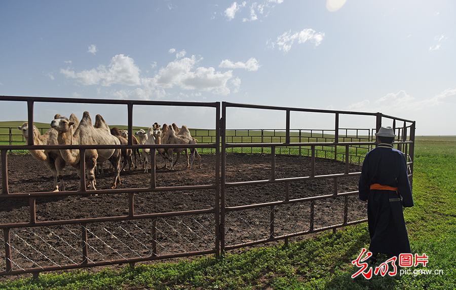 在陳巴爾虎旗,每一個牧民都以家里養(yǎng)著“五畜”為榮。五畜,及綿羊、山羊、牛、馬和駱駝。除了十幾頭駱駝,其日麥拉圖家里還養(yǎng)著90多匹馬,1000多只山羊、綿羊,100多頭牛,真正實(shí)現(xiàn)了五畜興旺。圖為2020年8月2日,其日麥拉圖巡視駱駝群的健康情況。(潘迪攝/光明圖片)
