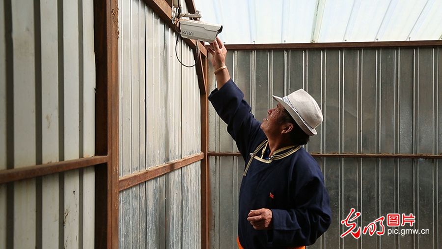 為了第一時間掌握到牲畜的情況,在其日麥拉圖的帶領(lǐng)下,許多牧民都在自家的牛舍、羊圈里安裝了監(jiān)控。圖為2020年8月2日,其日麥拉圖查看羊圈里監(jiān)控?cái)z像頭的運(yùn)轉(zhuǎn)情況。(李剛攝/光明圖片)