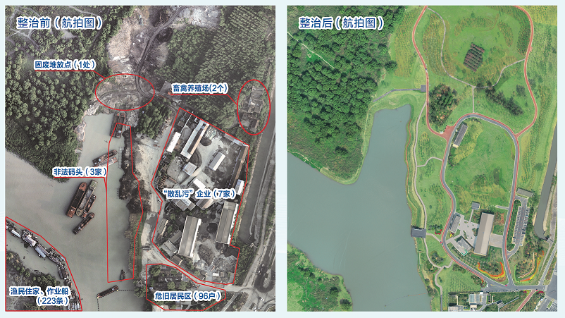 薛家洼生態(tài)園地處長江東岸,占地986畝,曾經(jīng)生態(tài)環(huán)境問題非常突出,原有非法碼頭3家,散亂污企業(yè)7家,固廢堆場1處,規(guī)?;笄蒺B(yǎng)殖場2個,危舊民居96戶,停靠漁民作業(yè)船、住家船223條?!扒缣煲簧砘?,雨天一身泥”,這是曾經(jīng)薛家洼的真實寫照。