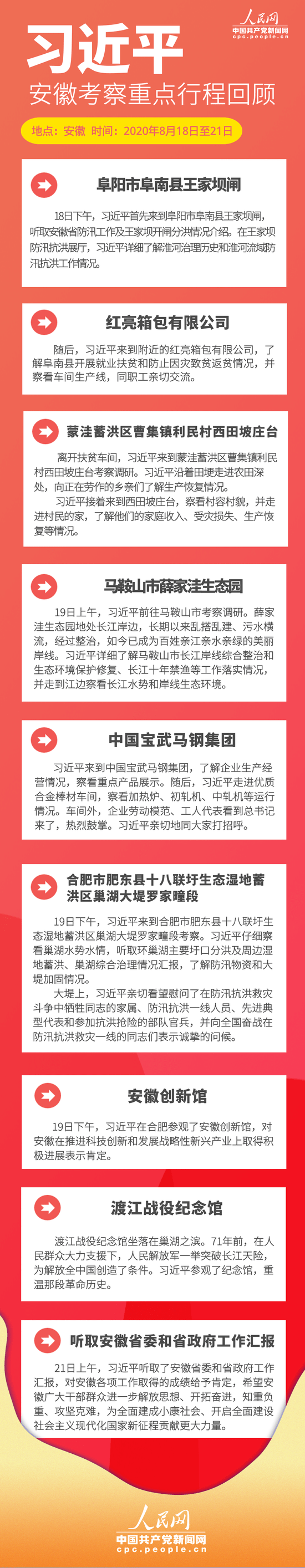 8月18日至21日,習近平來到安徽,看望慰問受災群眾和防汛救災一線人員,就統籌推進常態(tài)化疫情防控和經濟社會發(fā)展工作、加強防汛救災和災后恢復重建、推進長三角一體化發(fā)展、謀劃“十四五”時期經濟社會發(fā)展進行調研。