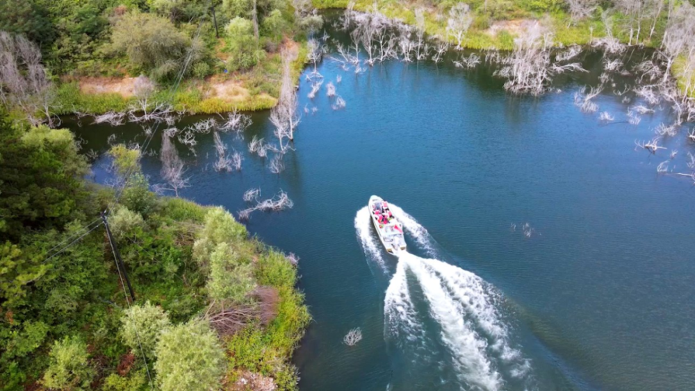 8月21日拍攝的北京市密云水庫綜合執(zhí)法大隊水上分隊隊員執(zhí)行任務(無人機拍攝)(記者夏子麟攝)