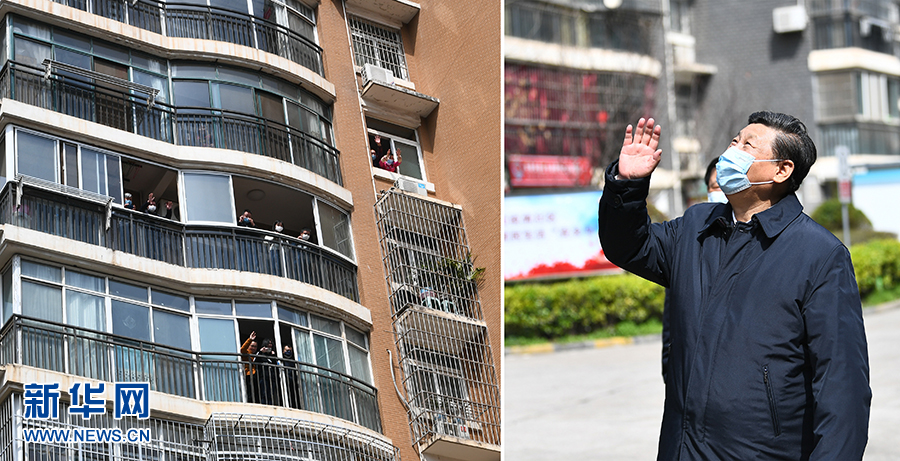 3月10日,習近平專門赴湖北省武漢市考察新冠肺炎疫情防控工作。這是習近平在東湖新城社區(qū)考察時,向在家隔離居住的居民揮手致意、表示慰問(拼版照片)。 新華社記者 謝環(huán)馳 攝