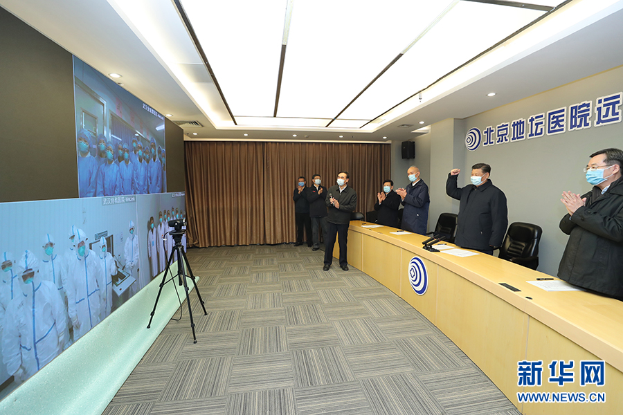 2月10日,習近平在北京調(diào)研指導新冠肺炎疫情防控工作。這是習近平在首都醫(yī)科大學附屬北京地壇醫(yī)院遠程診療中心,通過視頻連線武漢市收治新冠肺炎患者的金銀潭醫(yī)院、協(xié)和醫(yī)院、火神山醫(yī)院,了解情況、聽取意見和建議,慰問一線醫(yī)務工作者。 新華社記者 鞠鵬 攝