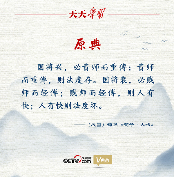 《荀子·大略》更是把教師地位提高到攸關(guān)國(guó)家興亡的高度:“國(guó)將興,必貴師而重傅;貴師而重傅,則法度存?!币馑际?,國(guó)家將要興盛,一定尊敬老師并看重有技能的人;如此,規(guī)矩和制度就能保持并得以推行。反之,國(guó)家將要衰微,一定鄙視老師并看輕有技能的人,如此人們就產(chǎn)生放肆之心;人有了放肆之心,規(guī)矩和制度就會(huì)被破壞。這一觀點(diǎn)在中國(guó)思想史上產(chǎn)生了十分深遠(yuǎn)的影響。