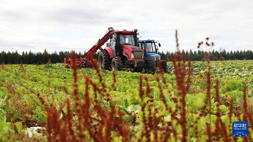 10月8日,在北大荒集團黑龍江紅星農(nóng)場第四管理區(qū),農(nóng)機在收獲白菜。(新華社發(fā) 侯越 攝)