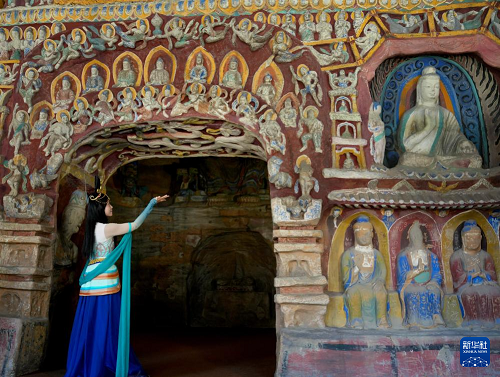 10月9日,在位于今潮8弄的戶外展區(qū),參觀者游覽云岡第12窟“音樂窟”的1:1復制洞窟。(新華社記者 劉穎 攝)