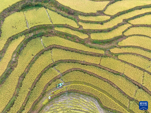 10月10日,湖北省宜昌市秭歸縣沙鎮(zhèn)溪鎮(zhèn)長(zhǎng)春村村民駕駛農(nóng)機(jī)在田間收獲水稻(無(wú)人機(jī)照片)。(新華社發(fā) 雷勇 攝)