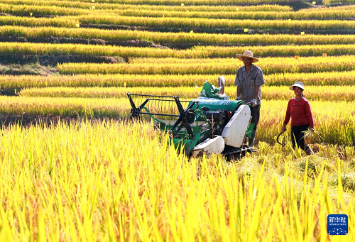10月10日,湖北省宜昌市秭歸縣沙鎮(zhèn)溪鎮(zhèn)長(zhǎng)春村村民駕駛農(nóng)機(jī)在田間收獲水稻。(新華社發(fā) 王罡 攝)