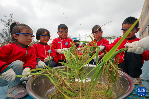 10月15日,云南省曲靖市陸良縣大莫古鎮(zhèn)中心幼兒園的孩子們在校內(nèi)勞動基地體驗打稻穗。(新華社發(fā) 王勇 攝)