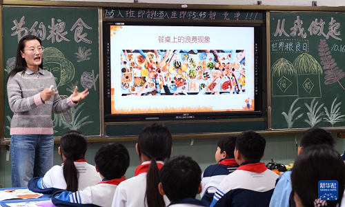 10月15日,河南省商丘市夏邑縣育才學校老師在世界糧食日主題班會上講解糧食知識。(新華社發(fā) 苗育才 攝)
