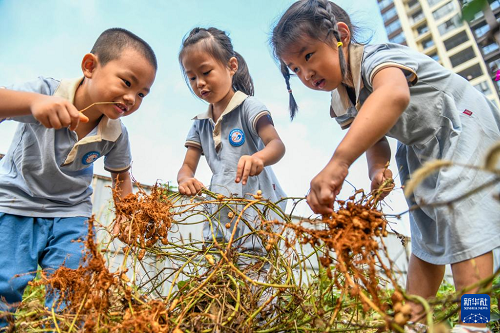 10月15日,在湖南省永州市道縣城東幼兒園,小朋友在體驗采收花生。(新華社發(fā) 蔣克青 攝)