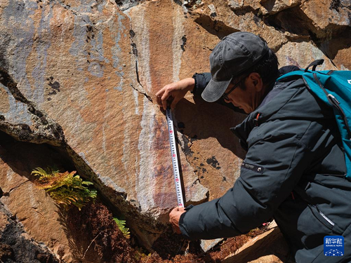 10月21日,陳雪松在實(shí)地調(diào)查海子山老林溝拉托扎巖畫。該處巖畫位于海子山南側(cè)老林溝內(nèi),巖畫由小型鹿圖案、三角形以及X型符號(hào)組成。(新華社記者 薛晨 攝)