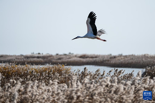 11月13日,在黃河三角洲國家級(jí)自然保護(hù)區(qū),白鸛在飛翔。(新華社記者 朱崢 攝)