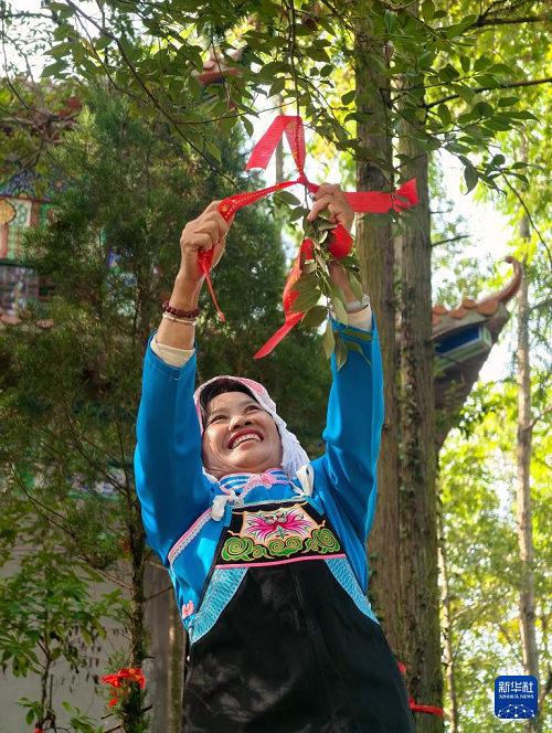 10月29日重陽(yáng)節(jié),廣西南丹縣群眾按照傳統(tǒng)習(xí)俗在樹木上懸掛福壽帶。(新華社發(fā) 高東風(fēng) 攝)