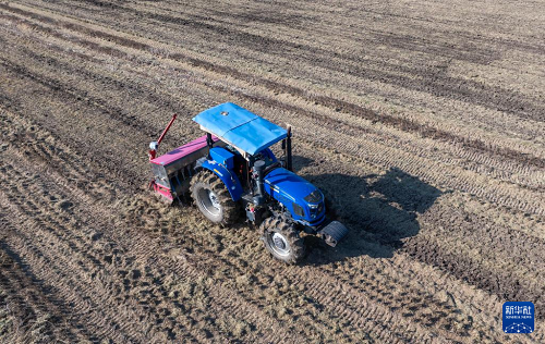 11月19日,在河南省商丘市睢縣鳳城街道劉樓村一處農(nóng)田內(nèi),農(nóng)機手駕駛播種機播種冬小麥。(新華社發(fā) 徐澤源 攝)