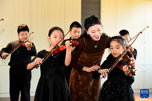 11月26日,在濟(jì)南市市中區(qū)泉海小學(xué),音樂(lè)老師夏霄霏在指導(dǎo)學(xué)生拉小提琴。(新華社記者 郭緒雷 攝)