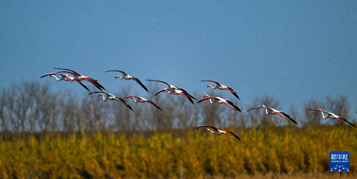 12月8日,火烈鳥(niǎo)在江蘇東臺(tái)條子泥濕地飛翔。(新華社發(fā) 孫家錄 攝)