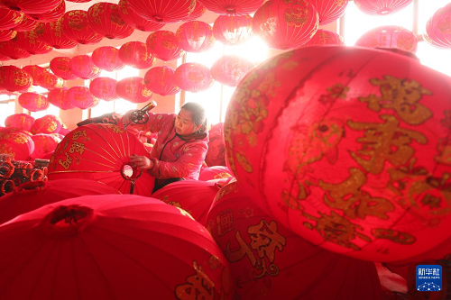 12月10日,工人在河北省石家莊市藁城區(qū)屯頭村一家宮燈廠制作宮燈。(新華社發(fā) 張曉峰 攝)