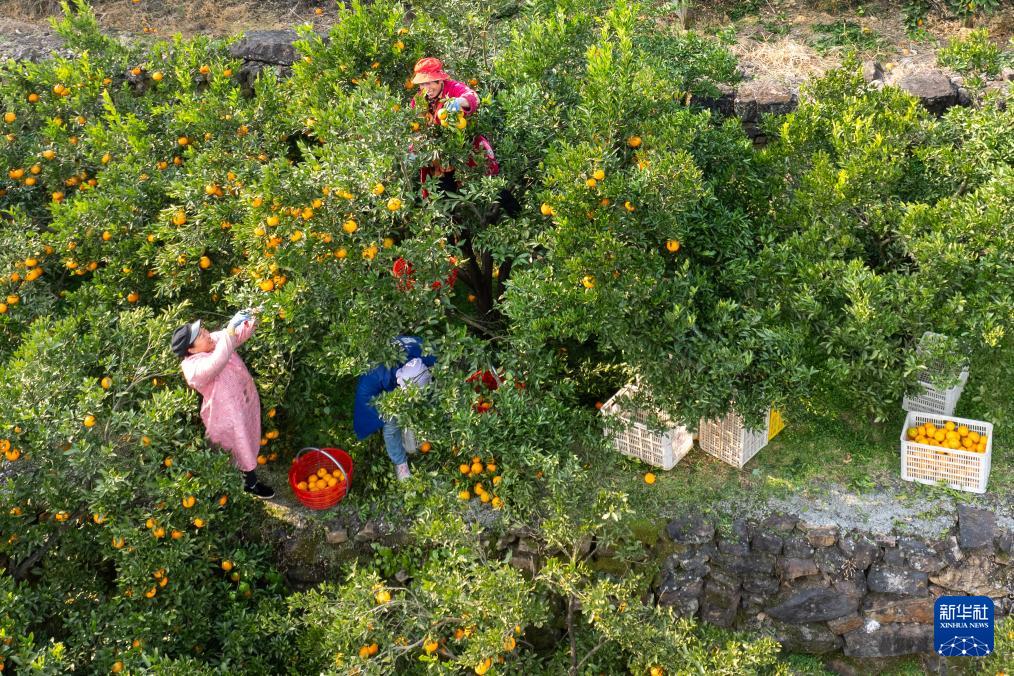 12月11日,在湖北省宜昌市長(zhǎng)陽(yáng)土家族自治縣漁峽口鎮(zhèn)巖松坪村,村民在采摘清江椪柑(無人機(jī)照片)。(新華社記者 杜子璇 攝)