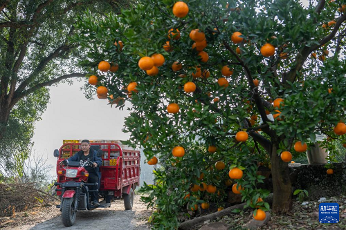 12月11日,在湖北省宜昌市長(zhǎng)陽(yáng)土家族自治縣漁峽口鎮(zhèn)巖松坪村,村民在轉(zhuǎn)運(yùn)剛采摘的清江椪柑。(新華社記者 杜子璇 攝)