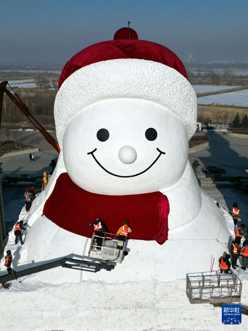 12月14日拍攝的建設(shè)中的哈爾濱市群力音樂公園網(wǎng)紅大雪人(無人機(jī)照片)。(新華社發(fā) 劉洋 攝)