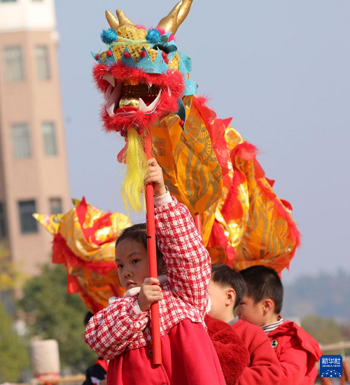 12月30日,江西省吉安市泰和縣淺水灣幼兒園小朋友在表演舞龍。(新華社發(fā) 鄧和平 攝)