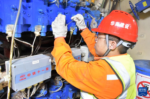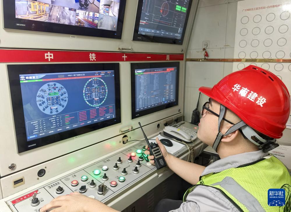 1月7日,工作人員在施工現(xiàn)場的控制室里調(diào)控機械設備。(新華社記者 盧漢欣 攝)