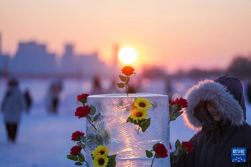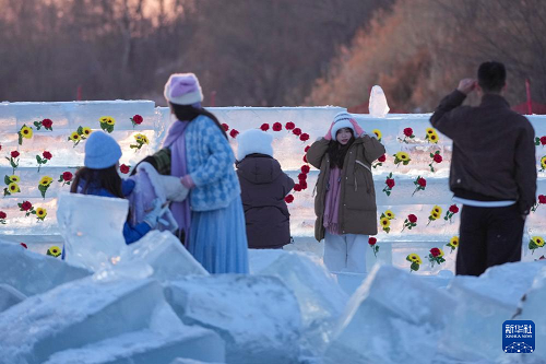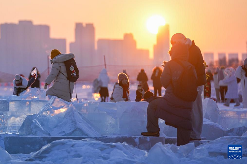 時下,“冰城”哈爾濱市正值冰雪旅游旺季。松花江哈爾濱段一處采冰場,由于大量堆積高純凈度的冰塊,而被游客稱為“鉆石?!保蔀榫W(wǎng)紅景區(qū)。只要是晴好天氣,都會有許多游客來到“鉆石?!本皡^(qū),欣賞浪漫的落日美景。