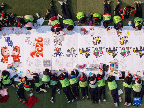 1月14日,榮縣樹人小學(xué)校的學(xué)生們在畫布上畫馬(無人機照片)。(新華社發(fā) 何海洋 攝)