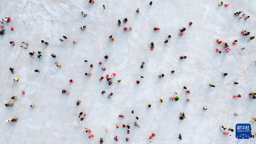 1月17日,市民在銀川文旅集團(tuán)覽山公園體驗(yàn)“冰浮小龍蝦”特色項(xiàng)目(無(wú)人機(jī)照片)。(新華社記者 王鵬 攝)