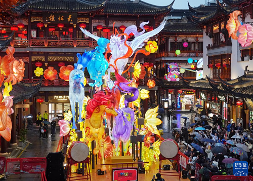 1月26日拍攝的豫園商城中心廣場(chǎng)上的馬年主題燈組“駿馳九州,步步生花”。(新華社記者 劉穎 攝)