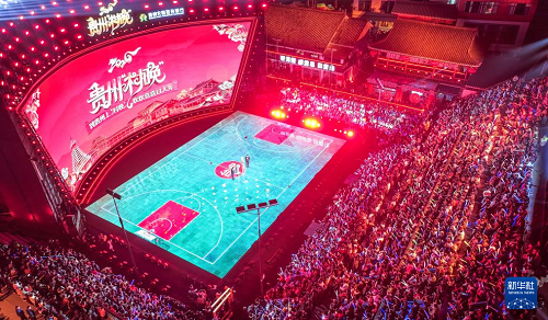 2月3日,觀眾在臺(tái)江縣臺(tái)盤鄉(xiāng)“村BA”球場(chǎng)觀看貴州“村晚”(無人機(jī)照片)。(新華社記者 楊文斌 攝)