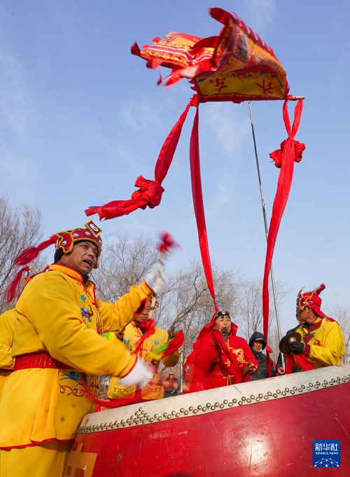2月5日,在山東省鄒平市臺(tái)子鎮(zhèn),黃河大鼓表演隊(duì)在文藝廣場為村民表演。(新華社發(fā) 董乃德 攝)