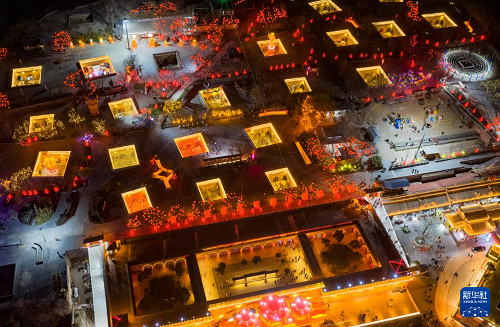 2月10日,人們?cè)诤幽鲜∪T峽市陜州區(qū)地坑院景區(qū)欣賞花燈(無(wú)人機(jī)照片)。(新華社發(fā) 孫猛 攝)