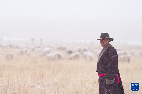 3月8日,在青海省海北藏族自治州祁連縣,牧人在雪中放牧。(新華社記者 張龍 攝)