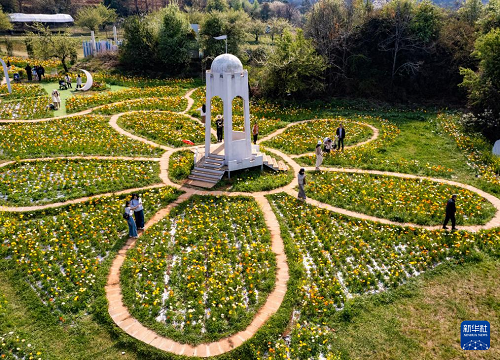 3月10日,游客在昆明名花谷游玩(無(wú)人機(jī)照片)。(新華社記者 陳欣波 攝)
