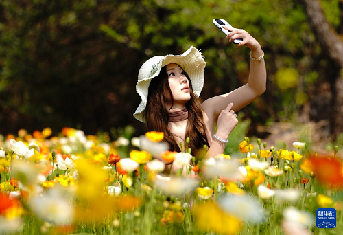 3月10日,一名游客在昆明名花谷的虞美人花叢旁拍照。(新華社記者 陳欣波 攝)