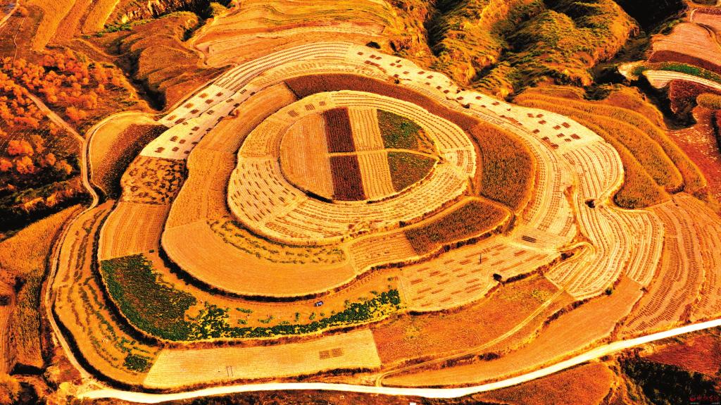 層層梯田滿(mǎn)目金黃,極目遠(yuǎn)眺宛如畫(huà)卷。河曲縣鄉(xiāng)村錯(cuò)落有致的梯田與曲折的道路相呼應(yīng),繪出一幅別致的田園風(fēng)光畫(huà)。(何 帥 楊成林?jǐn)z)