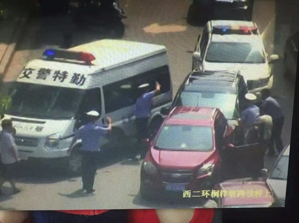長沙交警特勤大隊(duì)民警在桐梓坡路西二環(huán)橋下開展例行酒駕整治時(shí),車牌為湘A27K07的黑色小型越野車駕駛?cè)司懿幌ɑ?,并緊閉車門、車窗,拒絕出示相關(guān)證件和下車配合接受酒精測試。 圖片來源于新浪微博