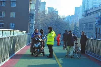 京華時(shí)報(bào)訊(記者張思佳)昨天,朝陽(yáng)呼家樓交通大隊(duì)的交警在雙井橋北一過(guò)街天橋上,對(duì)在天橋上騎行電動(dòng)車者進(jìn)行處罰,騎行者當(dāng)場(chǎng)被罰款20元。這是交管部門首次對(duì)電動(dòng)車騎行橫穿過(guò)街天橋進(jìn)行處罰。