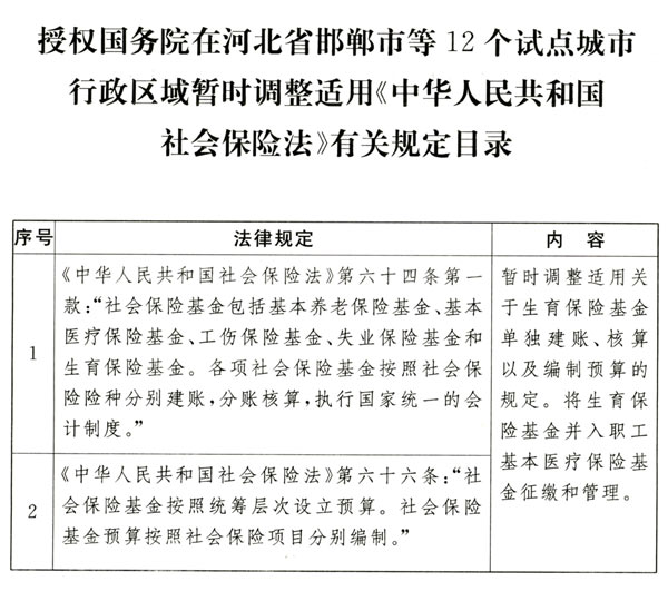 為進(jìn)一步增強(qiáng)生育保險(xiǎn)保障功能,提高社會(huì)保險(xiǎn)基金共濟(jì)能力,推進(jìn)生育保險(xiǎn)和基本醫(yī)療保險(xiǎn)合并實(shí)施改革,第十二屆全國(guó)人民代表大會(huì)常務(wù)委員會(huì)第二十五次會(huì)議決定:授權(quán)國(guó)務(wù)院在河北省邯鄲市、山西省晉中市、遼寧省沈陽(yáng)市、江蘇省泰州市、安徽省合肥市、山東省威海市、河南省鄭州市、湖南省岳陽(yáng)市、廣東省珠海市、重慶市、四川省內(nèi)江市、云南省昆明市行政區(qū)域暫時(shí)調(diào)整適用《中華人民共和國(guó)社會(huì)保險(xiǎn)法》第六十四條、第六十六條關(guān)于生育保險(xiǎn)基金單獨(dú)建賬、核算以及編制預(yù)算的規(guī)定(目錄附后),將生育保險(xiǎn)基金并入職工基本醫(yī)療保險(xiǎn)基金征繳和管理。試點(diǎn)方案由國(guó)務(wù)院作出安排,并報(bào)全國(guó)人民代表大會(huì)常務(wù)委員會(huì)備案。本決定實(shí)施期限為二年。