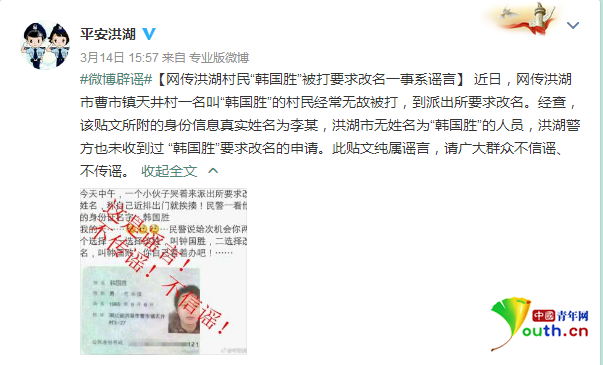 警方的辟謠微博顯示,近日,網(wǎng)傳洪湖市曹市鎮(zhèn)天井村一名叫"韓國(guó)勝"的村民經(jīng)常無(wú)故被打,到派出所要求改名。經(jīng)查,該貼文所附的身份信息真實(shí)姓名為李某,洪湖市無(wú)姓名為"韓國(guó)勝"的人員,洪湖警方也未收到過(guò)"韓國(guó)勝"要求改名的申請(qǐng)。此貼文純屬謠言,請(qǐng)廣大群眾不信謠、不傳謠。(見習(xí)記者 劉利影)